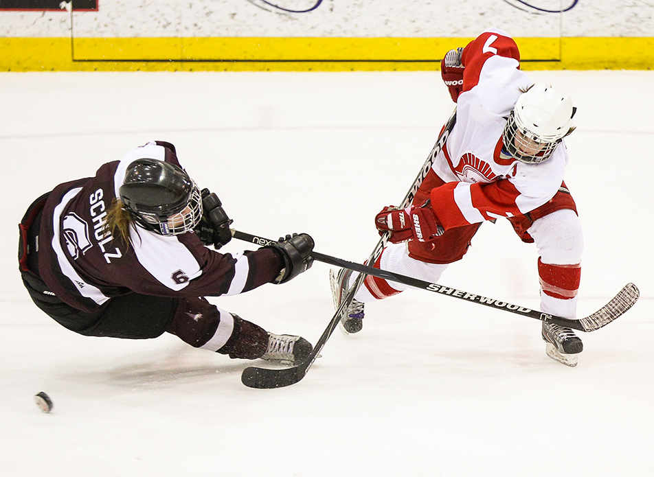 Fanned Shot: Bret Howe, right, of the SAIT Trojans fights for a puck against Samantha Schultz, left, of the Grant MacEwan Griffins during ACAC women’s hockey action on Saturday, Feb. 1, 2014. The Trojans were defeated 3-1. (Photo by Jenn Pierce/The Press)
