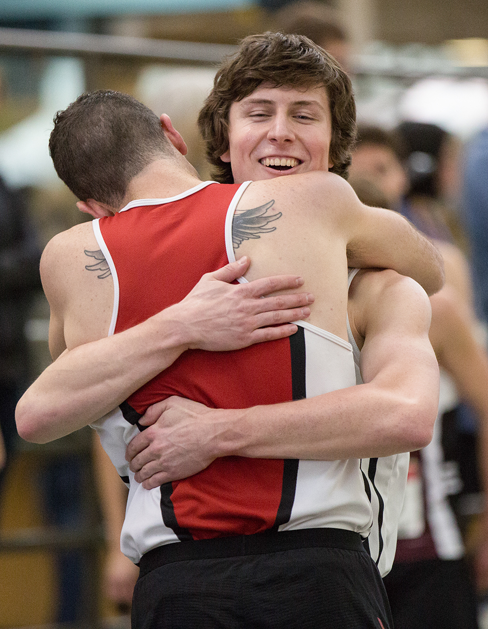 Celebration: Kenton Sportak, left, hugs SAIT Trojan team mate Jordan Fisher, right, after competing in the 4×4 men’s relay race during the Trojan invitational indoor track meet at the Talisman Centre in Calgary on Saturday, Feb. 1, 2014. (Photo by Jenn Pierce/The Press)