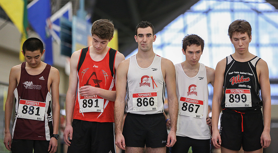 Pre-Race Nerves: Competitors wait nervously at the starting line for the 1500m race to begin at the Trojan invitational indoor track meet at the Talisman Centre in Calgary on Saturday, Feb. 1, 2014. This is the first year that indoor track has been part of the ACAC athletic circuit. (Photo by Jenn Pierce/The Press)