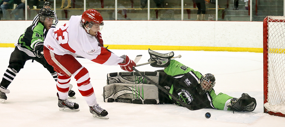 Big Stretch: SAIT Trojan forward Ben O’Quinn, centre, tries to sneak the puck over Red Deer Kings goalie Kraymer Barnstable during ACAC hockey action on Friday, Feb. 7, 2014. The Trojans defeated the Kings by a score of 5-3. (Photo by Sarah Collins/The Press)