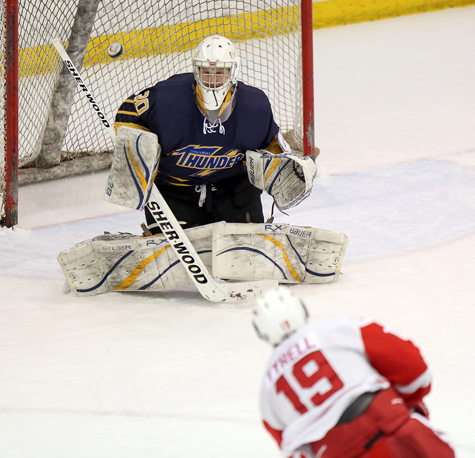 Top Shelf: SAIT Trojans Corey Tyrell goes top shelf on Concordia Thunder goalie, Rhys Hadfield while on a breakaway in the second period Saturday, Feb. 15, 2014. The Trojans defeated the Thunder by a score of 8-3. (Photo by Sarah Collins/The Press)