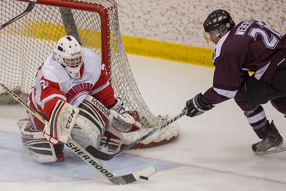 Big Save: MacEwan Griffins Karl Werberg, right, has the puck poke checked off his stick by SAIT Trojans goalie Jacob Edwards Saturday, Feb. 22, 2014. The Trojans defeated the Griffins by a score of 5-2. (Photo by Evan Buhler/The Press)