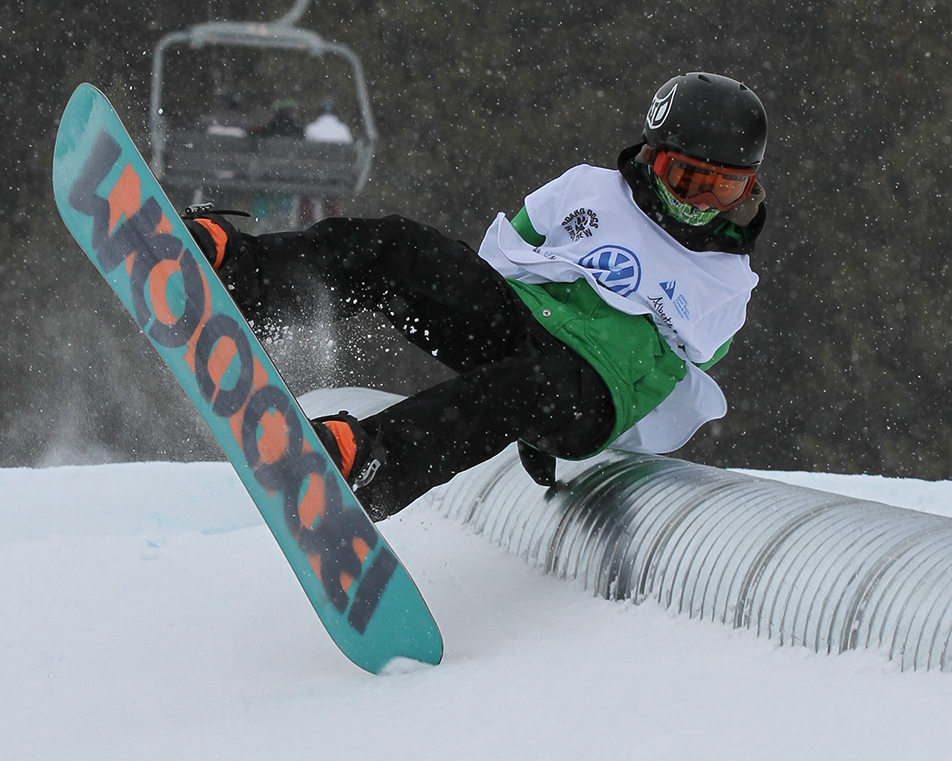 Hard Landing: Mateo Massitti wipes out on the rail during his qualification run for the slopestyle portion of the Style & Cross Series IV at Lake Louise Ski Resort on Saturday, Feb. 22, 2014. The event was run by the Alberta Snowboarding Association, who are celebrating their 25th year anniversary. (Photo by Kim Gordon/SAIT Polytechnic)