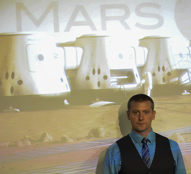 Zach Trolley poses in front a slide depicting what a village on Mars would look like, at the University of Calgary Event Centre during Beakerhead in Calgary on Wednesday, Sept. 10, 2014. Trolley is one of 705 people short-listed for the one-way trip to Mars (Photo by Adrianna Thebault/The Press)
