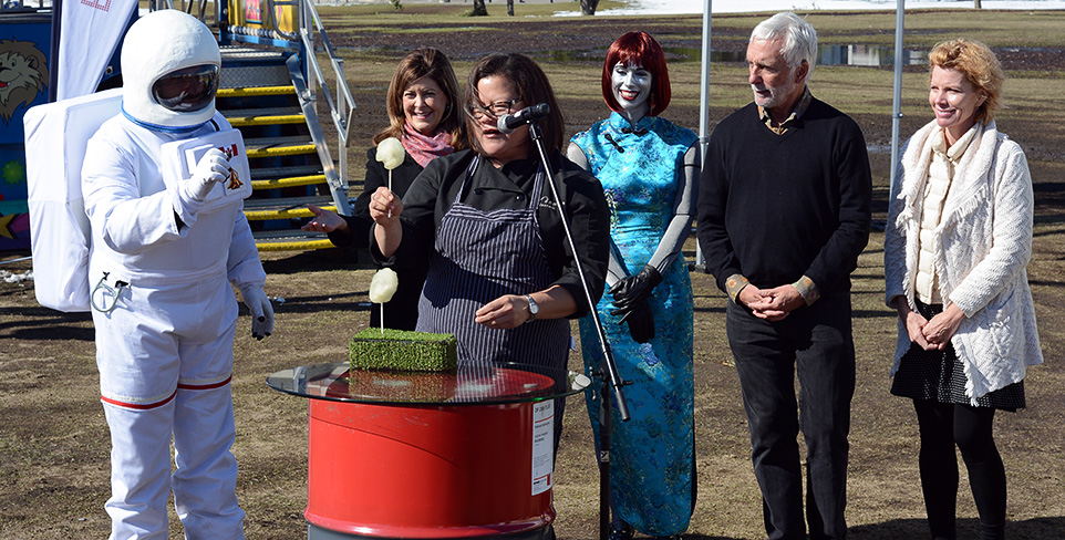 Sweet beginnings: Nicole Gomes, a Canada’s Top Chef contestant, introduces her ‘k’otton kandy potassium atom dessert for the Periodic Table event. Gomes is a Canada’s Top Chef contestant and created the event’s entire menu with the help of her team. Pictured from left to right are Steve Nagy, Joan Crockatt, Zoë Klintberg, Jay Ingram, and Mary Anne Moser. (Photo by Angela Brown/The Press)