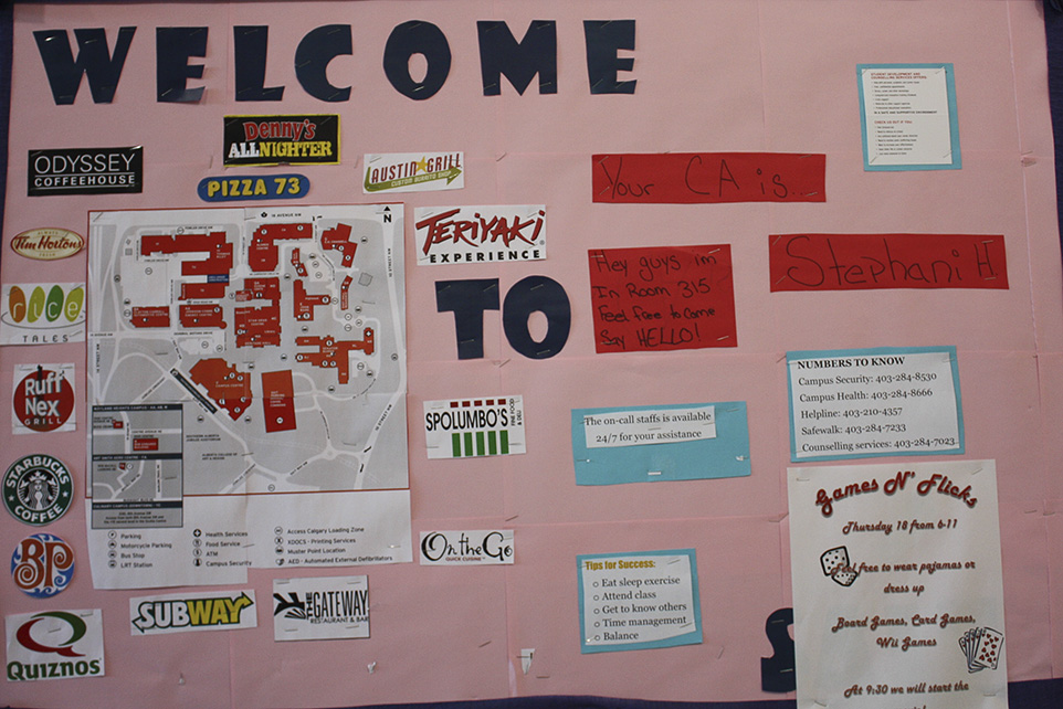 Move in Day: A SAIT residence bulletin board in the lobby of the Begin Tower. (Photo by Robyn Hertz/The Press)