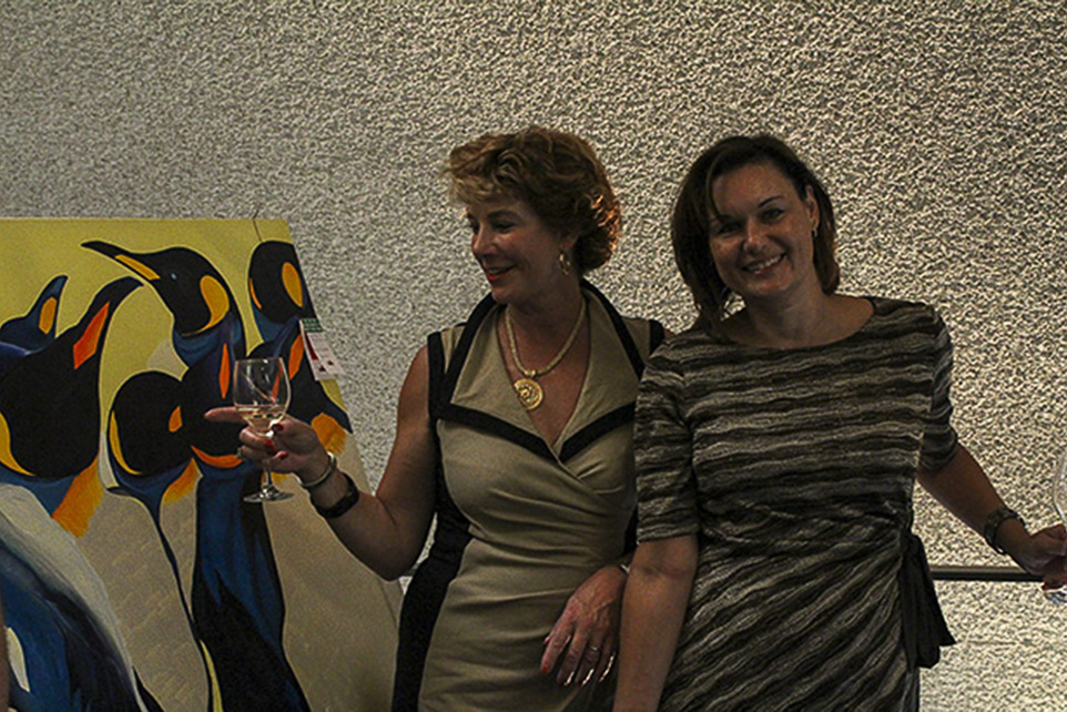 Conversational Piece: Diane Langlois, left, discusses her painting with Art Up event planner, Marion Spencer. The event took place in the Calgary Tower on Thursday, Sept. 18, 2014. (Photo by Jordyn Thomson/The Press)
