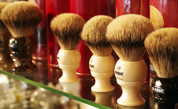 All lined up: Shaving brushes sit on a row on a display shelf in Kent of Inglewood, a newly opened men’s specialty shop located on 9th Avenue and 13th Street SE. Sept. 12, 2014. These brushes are traditionally used to apply shaving creams and lathers to the face while using a straight razor. (Photo by Adrian Hopkins/The Press)