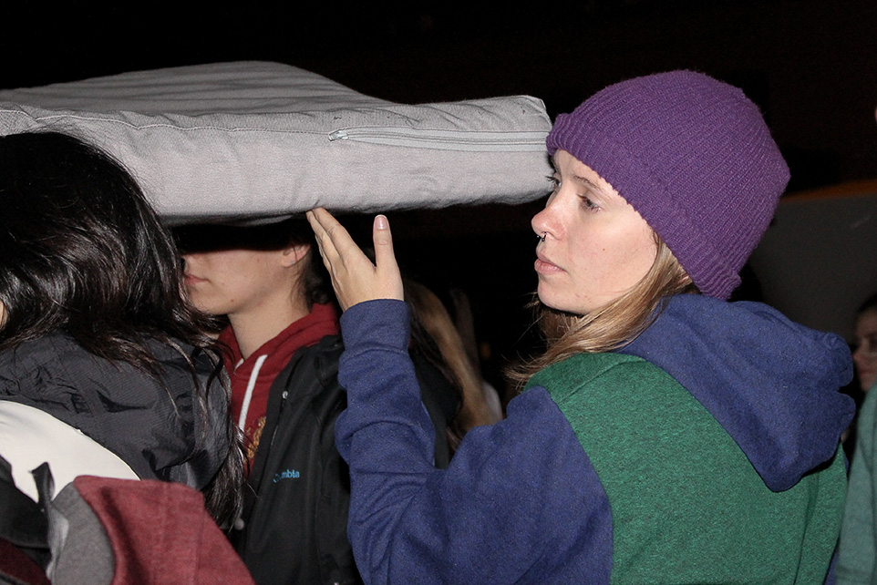 Night Walk: A young woman carries around a mattress with her friends during the Take Back the Night march in Calgary on Friday, Sept. 19, 2014. The mattress they carry references University of Columbia student, Emma Sulkowicz, who carries her mattress around campus after no action was done about her sexual assault. (Photo by Maria Bessant/The Press)