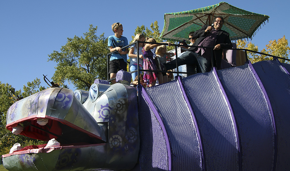 Mayor Naheed Nenshi addresses a crowd of event goers on top of a giant fire breathing hippo provided by Beakerhead at South Calgary Park in Marda Loop during Circle the Wagons on Saturday, Sept. 20, 2014. Circle the Wagons is a yearly charity event held for the first time in 2014, featuring food trucks, live music, circus performers as well as a beer garden. (Photo by Sierra St John/The Press)