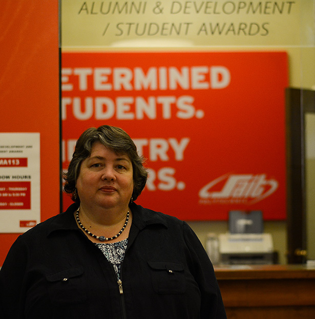 Donna Lambert poses in front of the student awards window at SAIT Polytechnic in Calgary on Monday, Sept. 22, 2014. Donna Lambert is the awards coordinator for Alumni and Development at SAIT. (Photo by Megan Trudeau/The Press)