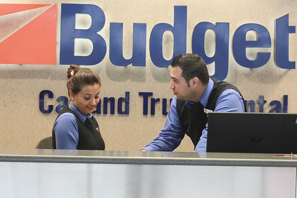 Rental Cars Scarcity Ashika Maharaj discusses work with Zaid Ramzi at the Calgary International Airport. (Photo by Kevin Gritton/The Press)