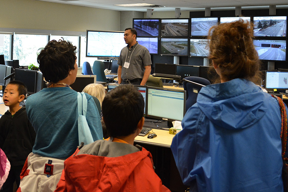 Showing off: Syed Ali, a technician for the Traffic Management Centre, speaks to a gathered crowd about the work done at the centre on Sunday, Sept. 28, 2014. The screens set up behind Ali are the only screens that the technicians are able to monitor to gather information. (Photo by Caleb Ross/The Press)