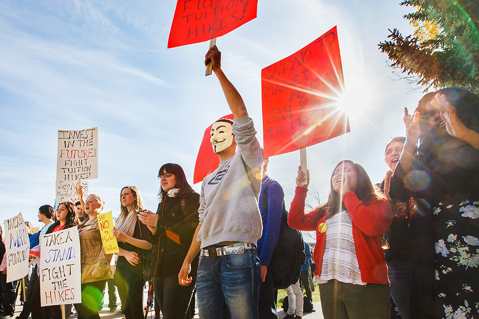 Stand Up Tall: MRU students protest tuition hikes in front of East Hall at Mount Royal in Calgary on Thursday, Oct. 9. Core programs at MRU and the U of C will be impacted because of cuts to post-secondary funding. (Photo by Mikaela MacKenzie/The Press)