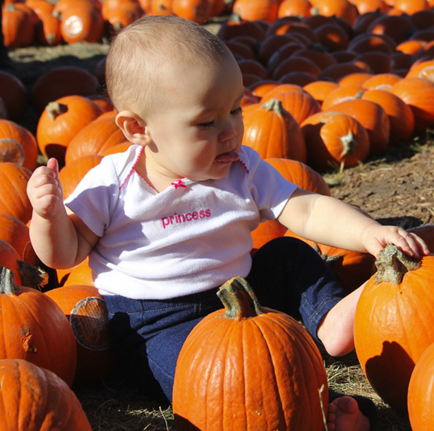 Eden Rothmann-Jung plays in the pumpkin patch during the Autumn Pumpkin Festival in Calgary on Saturday, Oct. 11, 2014. The Calgary Corn Maze hosts the annual festival on weekends through the fall and offers over 3,500 pumpkins of different varieties for guests to purchase. (Photo by Krista Conrad/The Press)