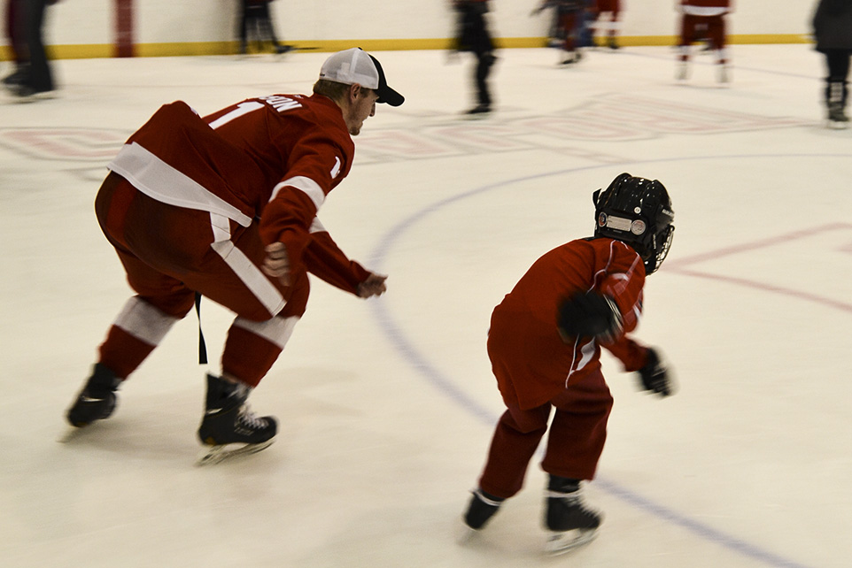 Trojans forward, Sam Larson races a young fan in Calgary on Saturday, Oct. 18, 2014. Skate With The Trojans. (Photo by {JamesYoung}/The Press) And They’re off