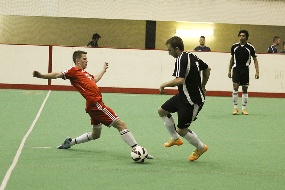 Get physical: Liam O’Brien, black jersey, of Division 4A team South City FC, attempts a tackle against CalGlen United player in Calgary on Tuesday, Oct. 21, 2014. South City FC are participating in a pre-season cup prior to the start of the indoor season on 1, Nov. (Photo by Connor Morrell/The Press)