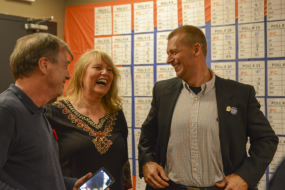 Victory for Ellis: Rob Spencer and Alana DeLong speak with Mike Ellis after his win for the Calgary West Riding in Calgary. Ellis said he could not have won without all of his supporters. (Photo by Kelsey Oster/The Press)