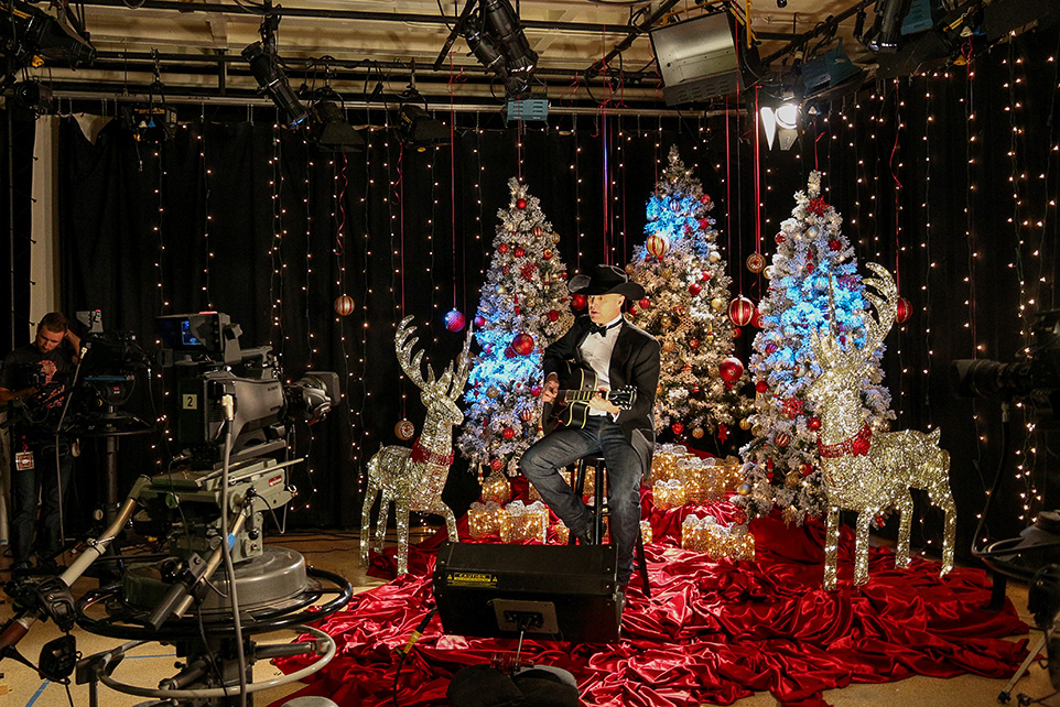 Ready, set, action: Corb Lund on set at SAIT shooting his Christmas music video, ‘Just me and these ponies.’ (Photo by Jenna Dulewich/The Press)