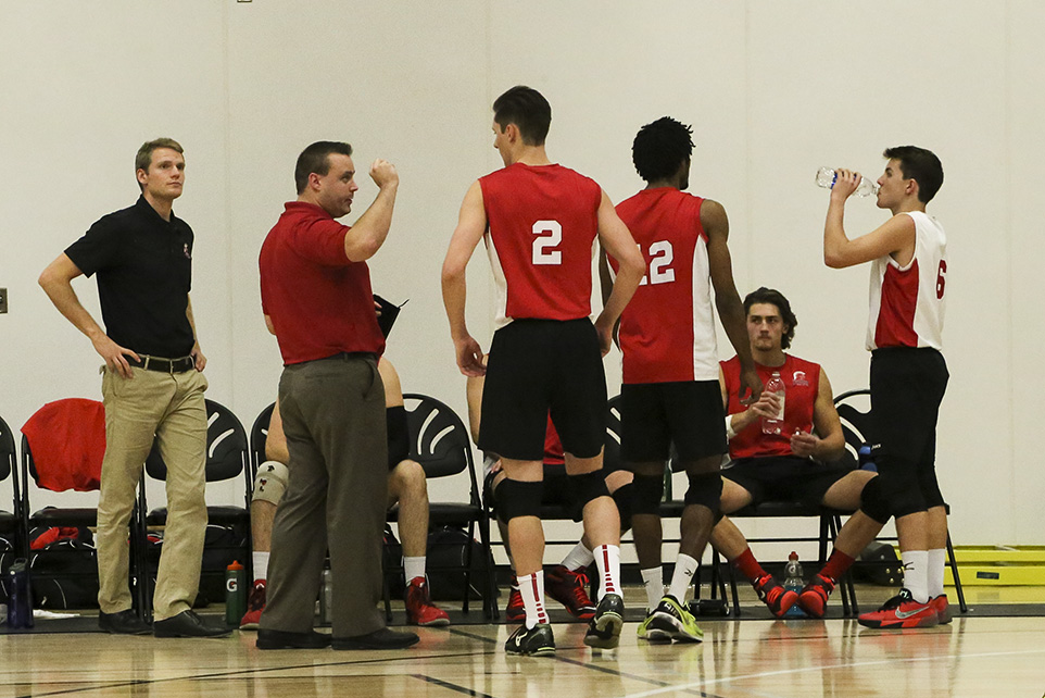 Ready, set, go: Head Coach Dan Gilbert, second from left, gives middle hitter Brett Bolin, 2, some pointers during a time out against the Medicine Hat Rattlers in Medicine Hat on Friday, Oct. 31. (Photo by Megan Brennan/The Press)