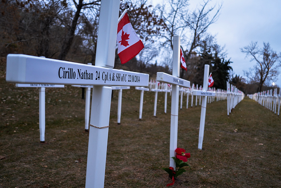 Standing United: A Cross memorial representing Cpl. Nathan Cirillo takes center stage at the Field of Crosses memorial in Calgary. There were 3300 other crosses on display all of them with the names of fallen soldiers from southern Alberta. (Photo by Nick Crimi/The Press)