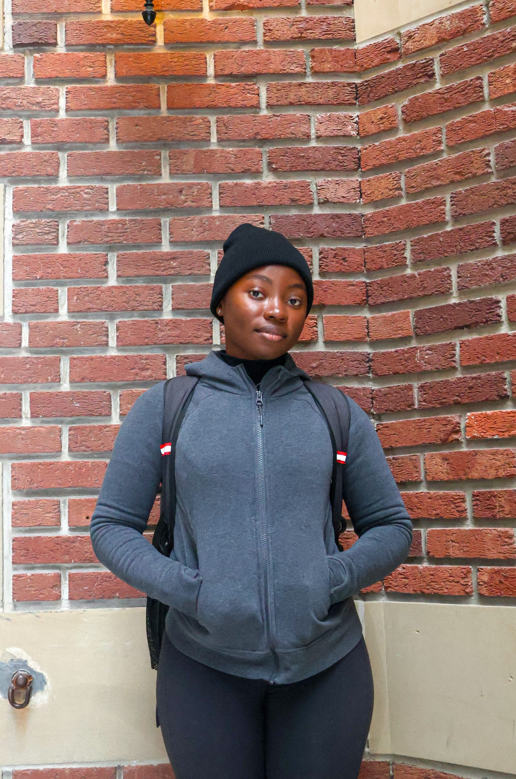 SAIT student Tobi Royebamiji poses in front of the brick wall of the Heritage Hall at Stan Grad Centre in Calgary, Alberta, on Oct ,12th, 2023 after she shared her struggle with paying tuition as a working student.