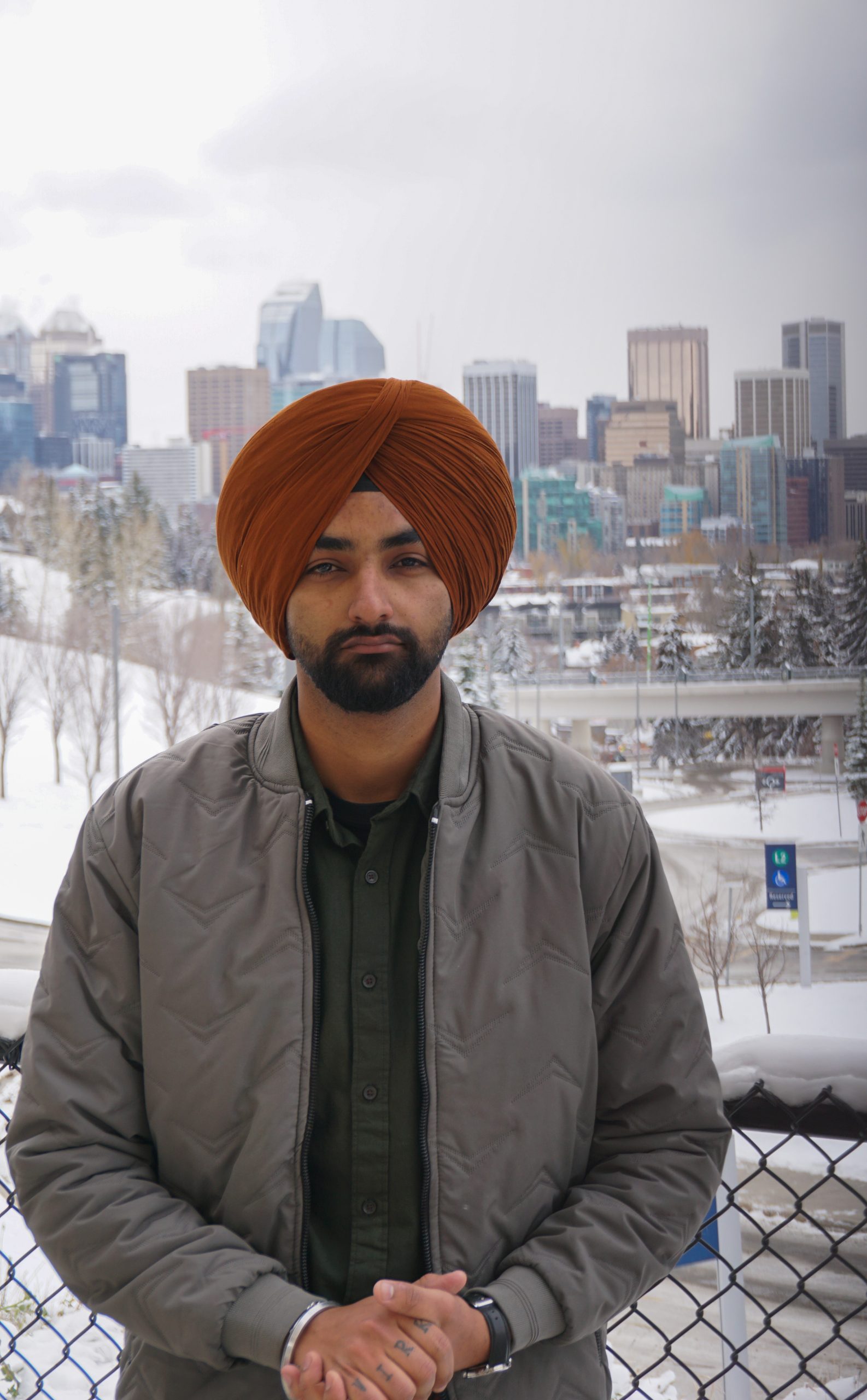 Jashandeep Singh standing outside at SAIT with the snowy city in the background on Thursday, October 26, 2023. Singh is new to Calgary, and after being excited by the first snowfall of the year is not looking forward to the rest of the winter. (Photo by Will Fisher/SAIT)
