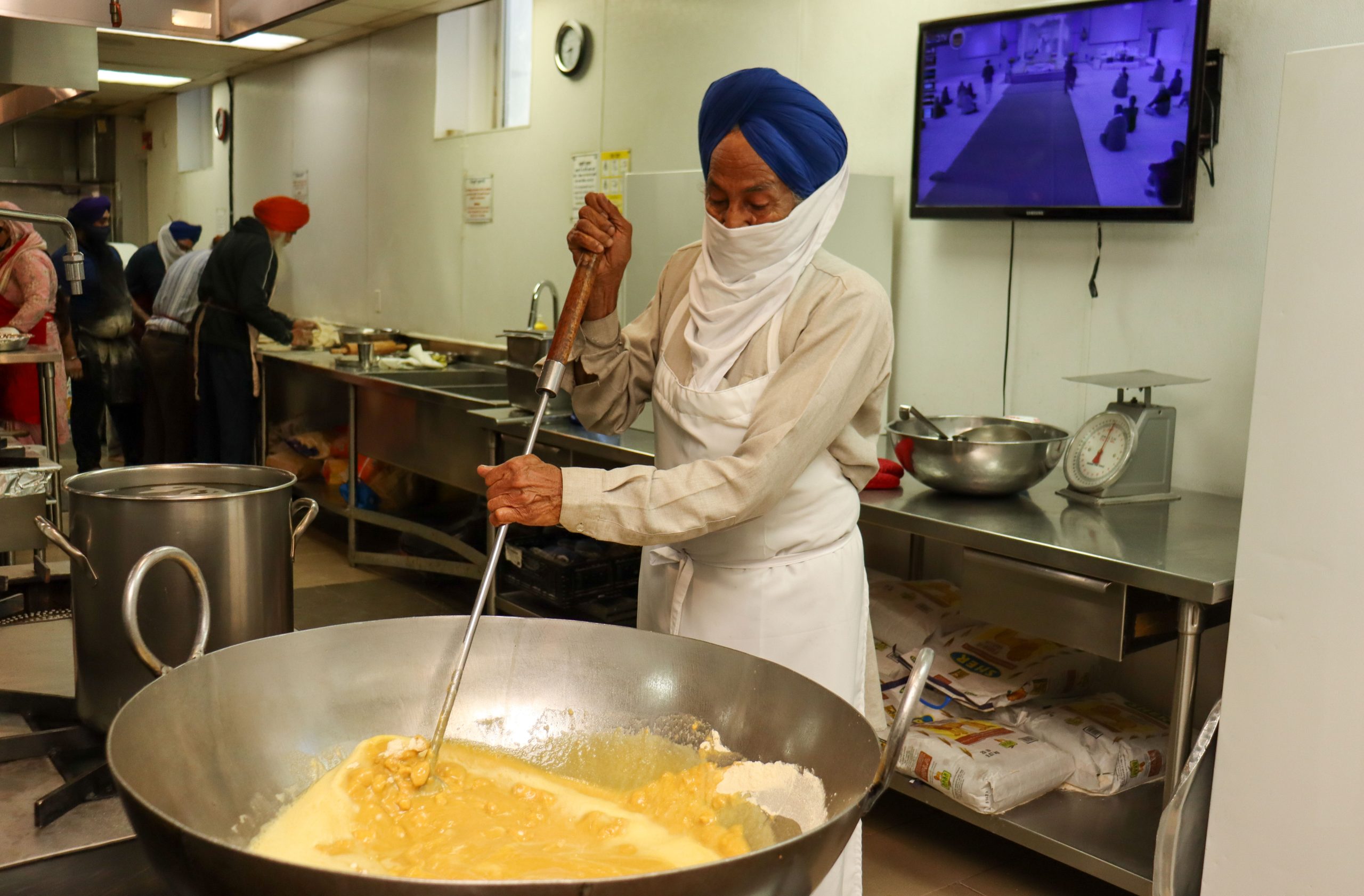 Nirmal singh a Sikh volunteer preparing deg (kadha Parshad) a ,mixture of wheat, sugar and clarified butter in equal quantity,for the people in langar in community kitchen of DCC( Dashmesh Culture Centre) Calgary, on Monday 30, 2023.
