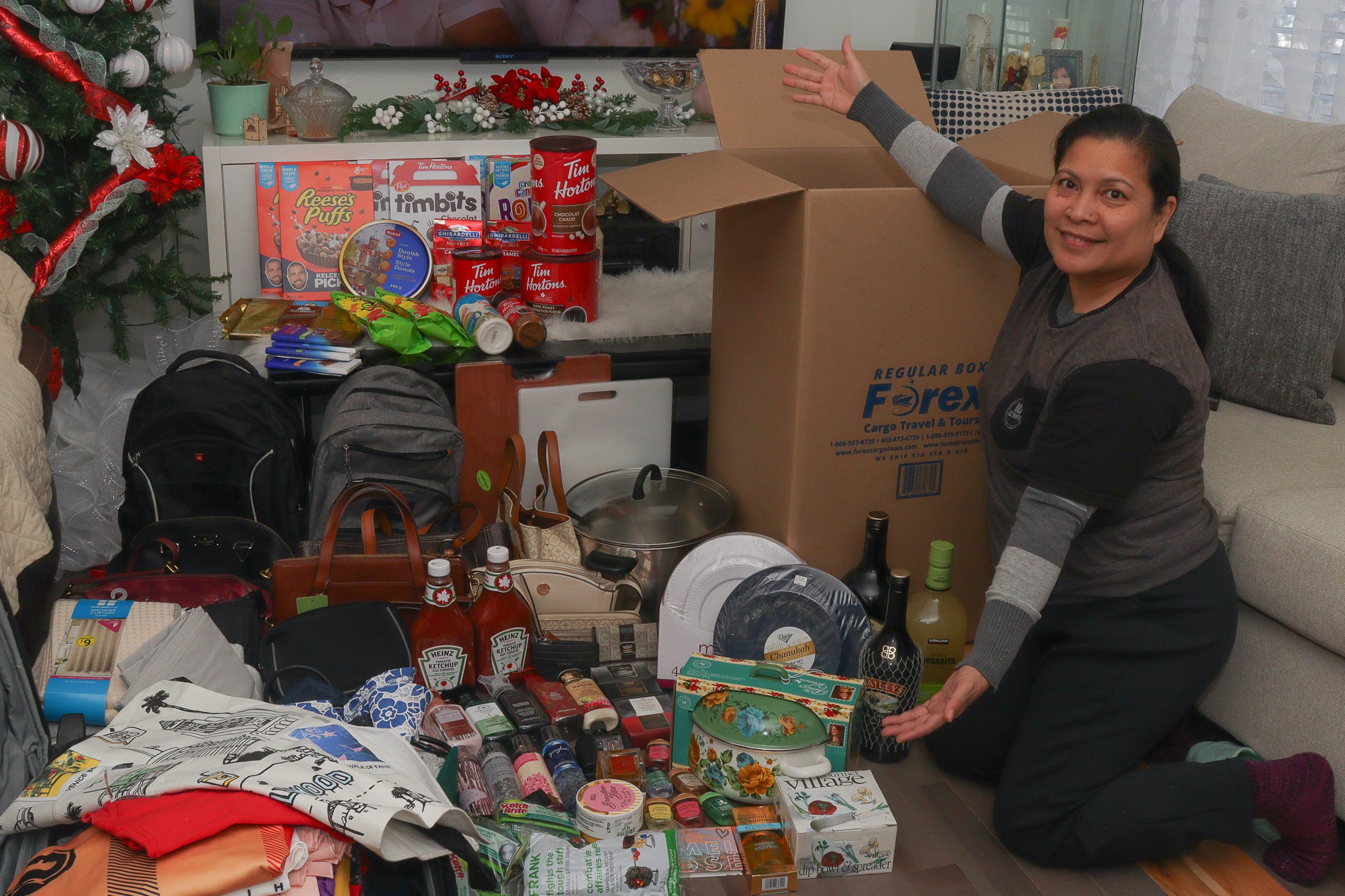 Love-filled box: Maria Diga showcases the items she’s packing for her balikbayan box to be sent to the Philippines in her residence in Calgary on Nov. 26, 2024. She is an overseas Filipino worker running 26 years. (Photo by Julia Acebes/The Press)