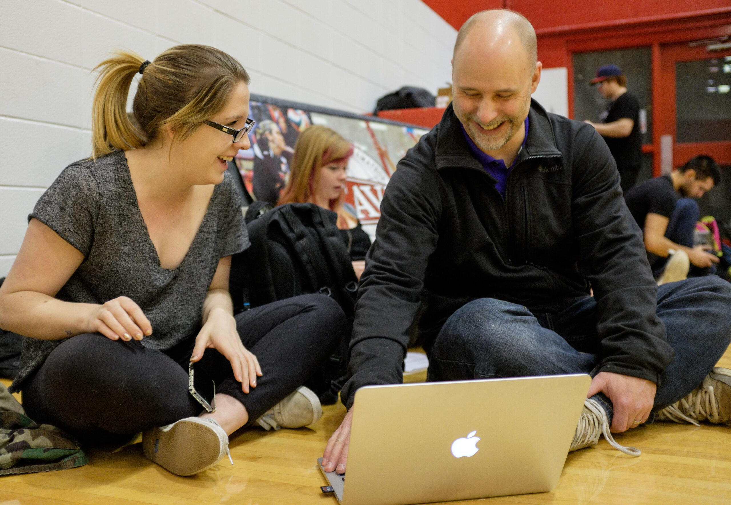 Kevin Udahl, right, queues up a cat video on the laptop of student Vanessa Paterson during a sports photography class at SAIT in Calgary on Thursday, Sept. 25, 2025. The photojournalism instructor recently returned to the classroom after serving a 13-month prison sentence for impersonating an effective teacher. (Photo by Rob Galbraith/The Press)