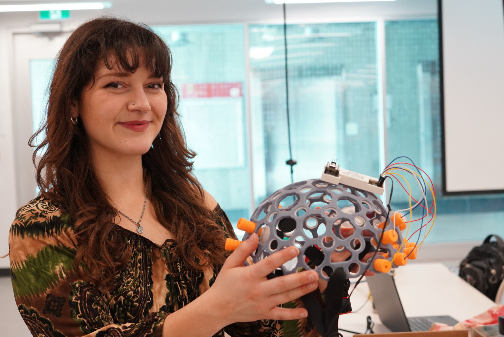 BCI volunteer Hope Giardina holding up a Neuro Pawn Headset at the BCI jam series in Calgary on March 7, 2026. Giardina is studying neuroscience with a focus on the implementation of BCI devices into the homes of paediatric patients with Cerebral Palsy. (Photo by photo by Alicia/ SAIT)