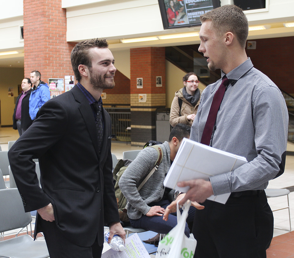 Friendly Competition: SAITSA Presidential candidates Jared Stock, left, and Spencer Janke have a friendly chat after the speeches are done on Speech Day, Monday, March 3, 2014. They will find out which of their fellow candidates will take over SAITSA on Friday, March 7, 2014. (Photo by Monica Henderson/The Press)