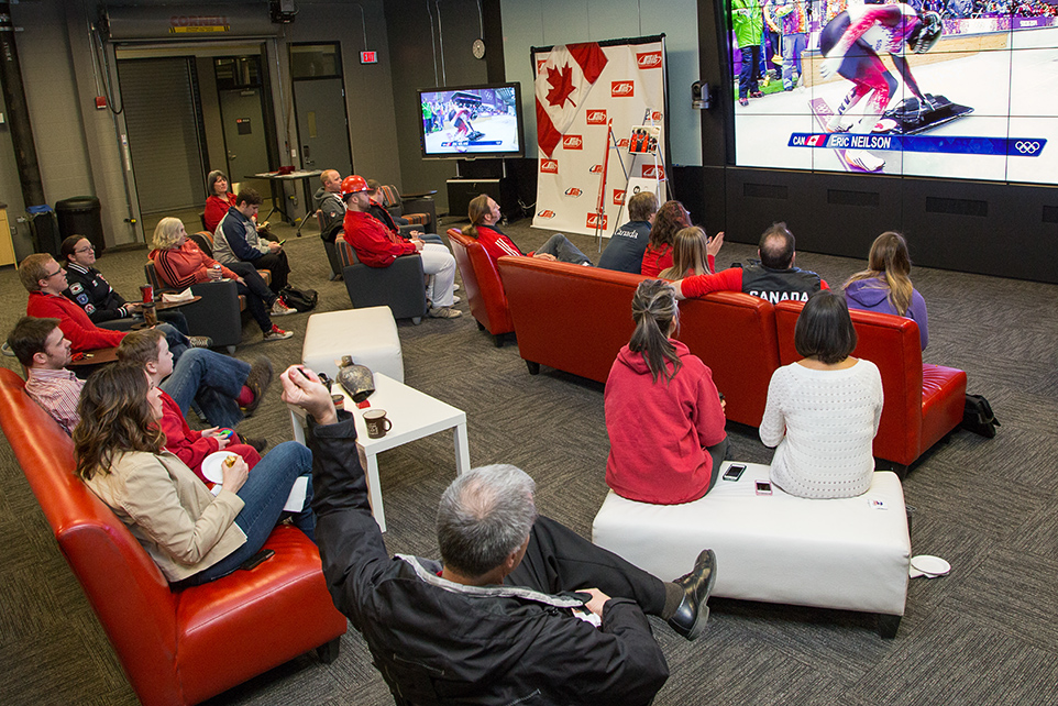 Cheering for SAIT: SAIT staff and students cheer on Olympic athletes Eric Neilson and John Fairbairn in the early-morning hours at SAIT’s Canada House in the Aldred Centre. The sleds used by the athletes were designed and manufactured by students and faculty at SAIT. (Photo by Anthony Samson/The Press)