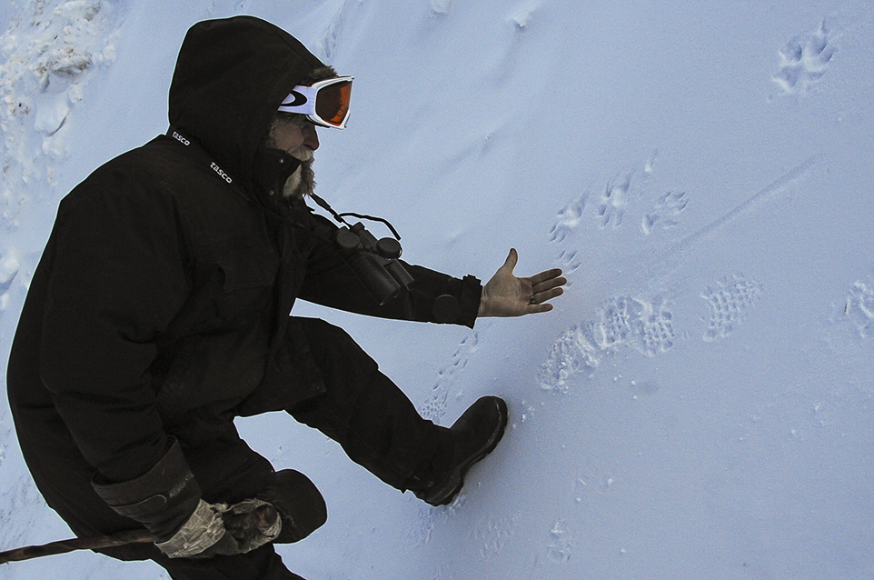 Citizen Coyote: Tyson Anderson examines what he believes to be a coyote track in Nose Hill Park during his volunteer project.