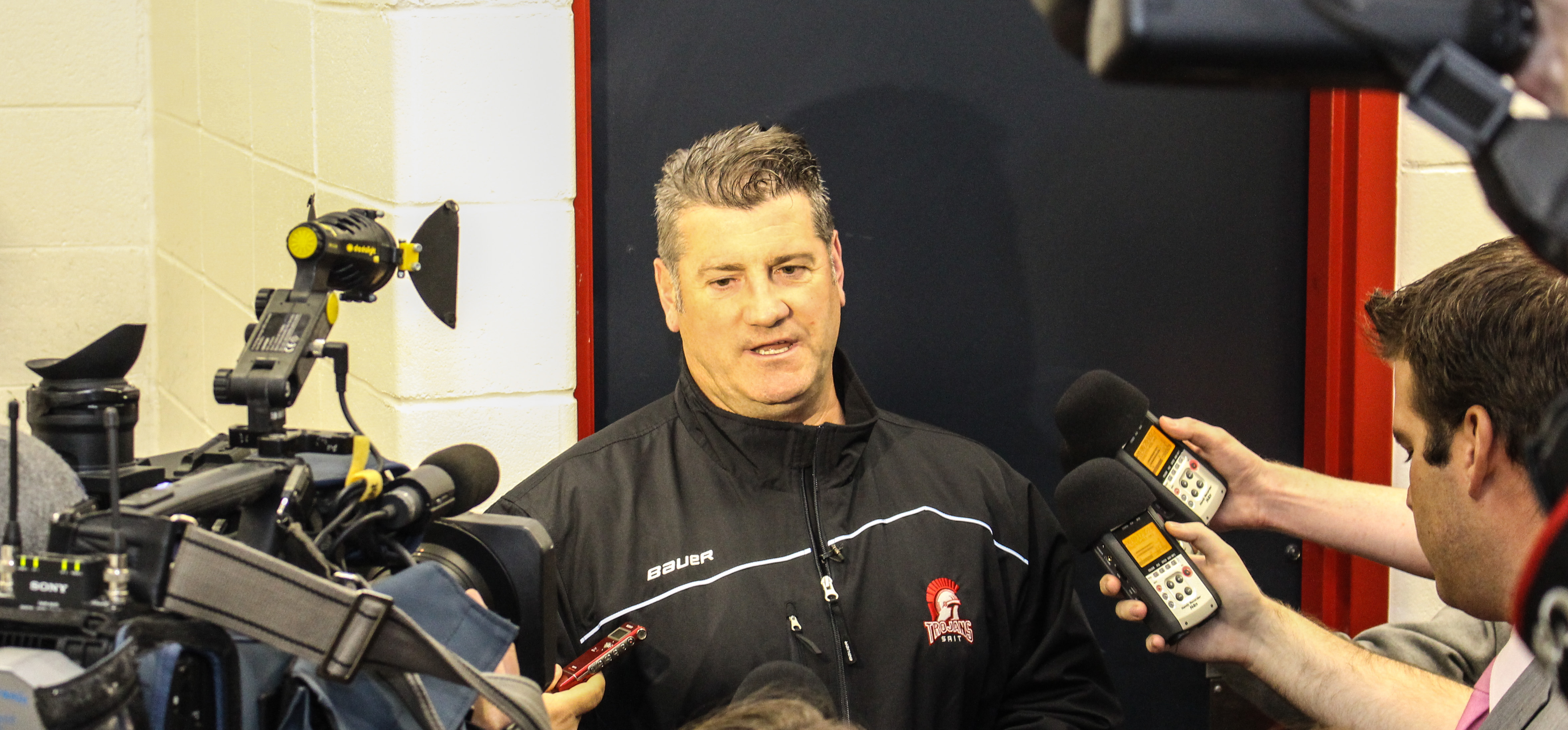 Filling Old Shoes: Dan Olsen takes part in a “meet and greet” media scrum at SAIT Campus Center Arena in Calgary. It has been 27 years since SAIT has had a new men’s hockey coach, and Olsen was more than happy to accept the challenge. (Photo by Luke Geddes/The Press)