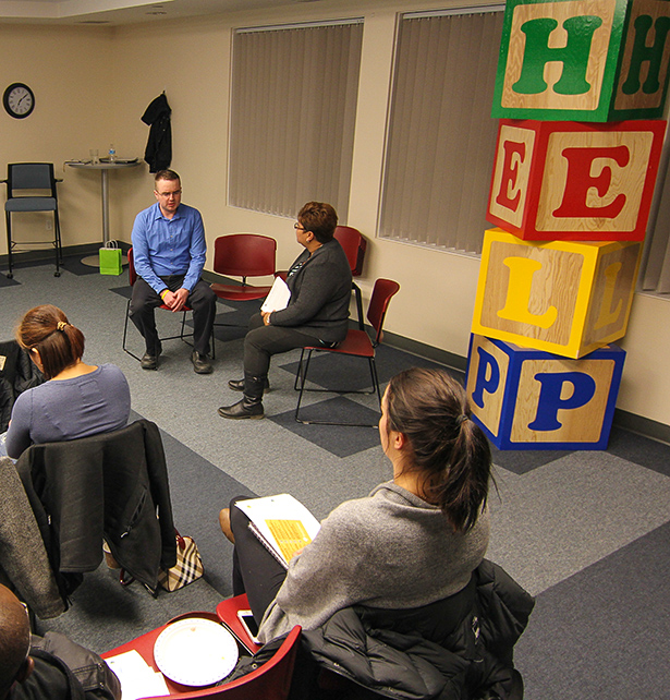 Group session: David McPhee, R. Psych., (blue shirt) one of the speakers at the ‘CTRL/ALT/DELETE’ parenting workshop about how to deal with bullying, and a parent participant, are playing the potential situation of how to speak with a child, who has being bullied, on Tuesday, Feb. 25, in Parkdale on 37th St. N.W. (Photo by Dmitry Kuleshov/The Press)