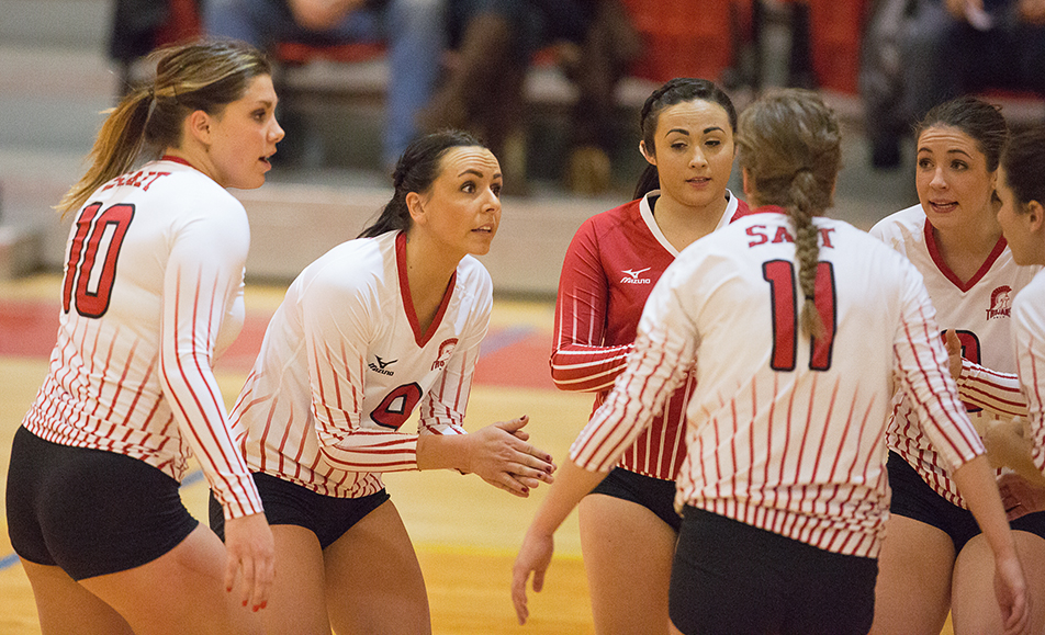 Stay Calm: Shantelle Jonassen, second from left, tries to calm down the rest of her teammates in the second set during women’s volleyball action against the Olds College Broncos at the SAIT Campus Centre gym in Calgary on Thursday, Dec. 5, 2013. The Trojans defeated the Broncos in five close sets. (Photo by Evan Buhler/The Press)