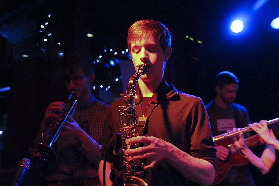 Stefan Haynes plays the saxophone alongside other members of Freak Motif at Broken City on Thursday Jan. 16, 2014. Freak Motif is an eight piece collective that improvises all their shows.(Photo by Inonge Chimwaso/The Press)