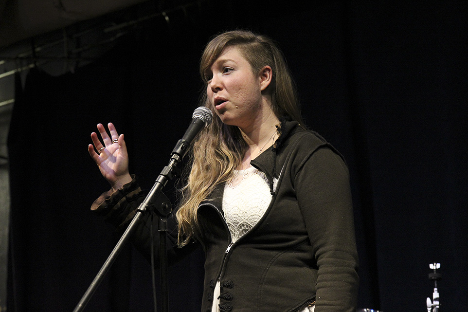 Spoken Word Poetry: Local poet engages the audience with her poetry during the Ink Spot Collective spoken word slam competition at Wine-Ohs Bistro and Cellar. (Photo by Inonge Chimwaso/The Press)