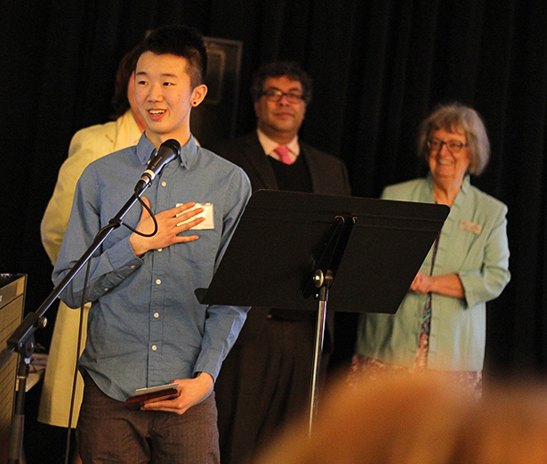 On the stage: Eric Cheung, who took ‘People’s Choice Award’ and second overall place, giving an emotional speech, on Wednesday, March 5, from 4:00 p.m. to 7:00 p.m. at Headspace on 10th Ave. S.W. (Photo by Dmitry Kuleshov/The Press)
