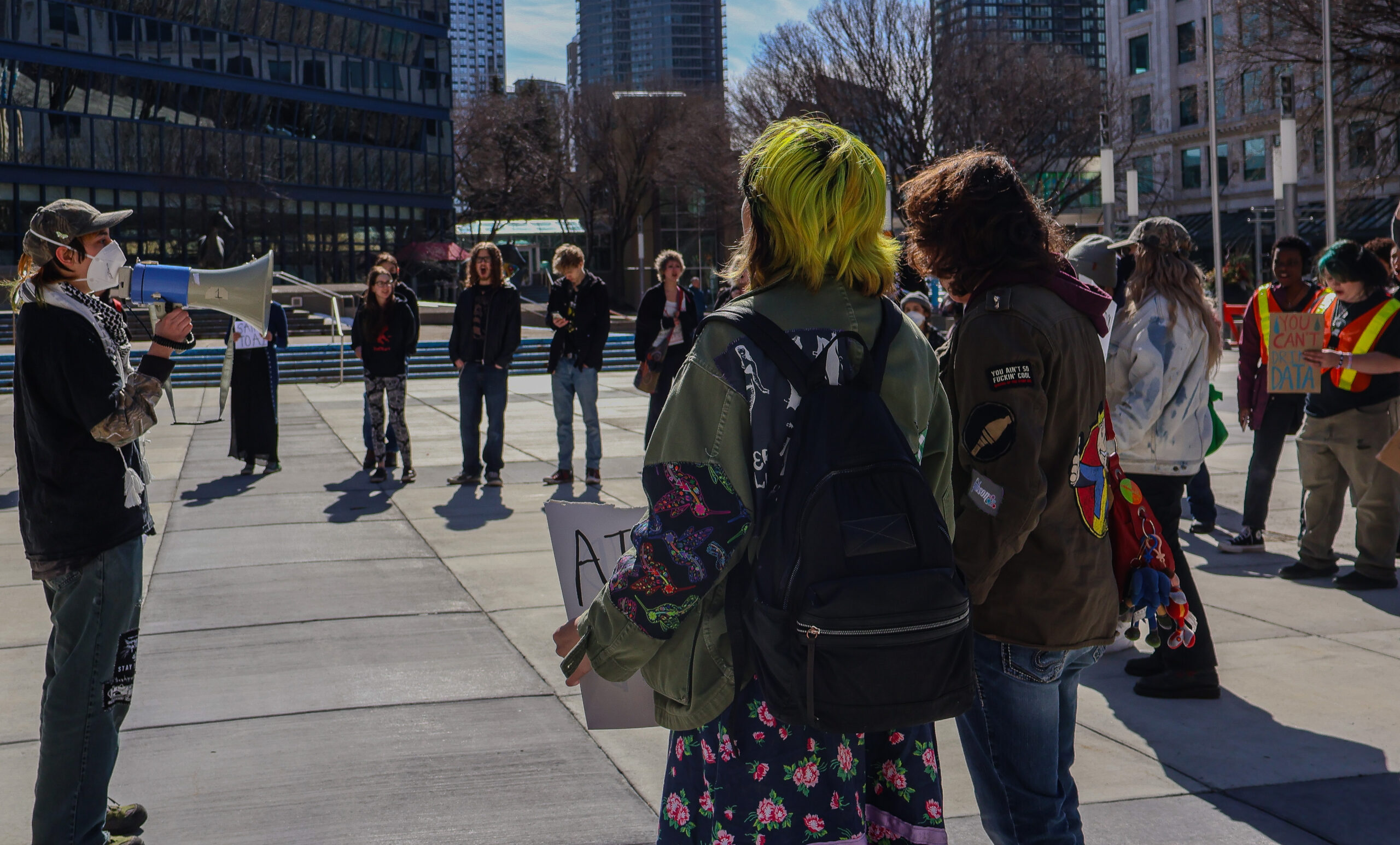 Protesters gather outside Calgary City Hall on March 23, 2026, during the “Stand Up to AI” rally, raising concerns about the social and economic impact of artificial intelligence and the development of data centres in Alberta. 15-year-old Xavier Phipps led the rally alongside co-organizers. (Photo by {Jullianah Ejoc}/SAIT)