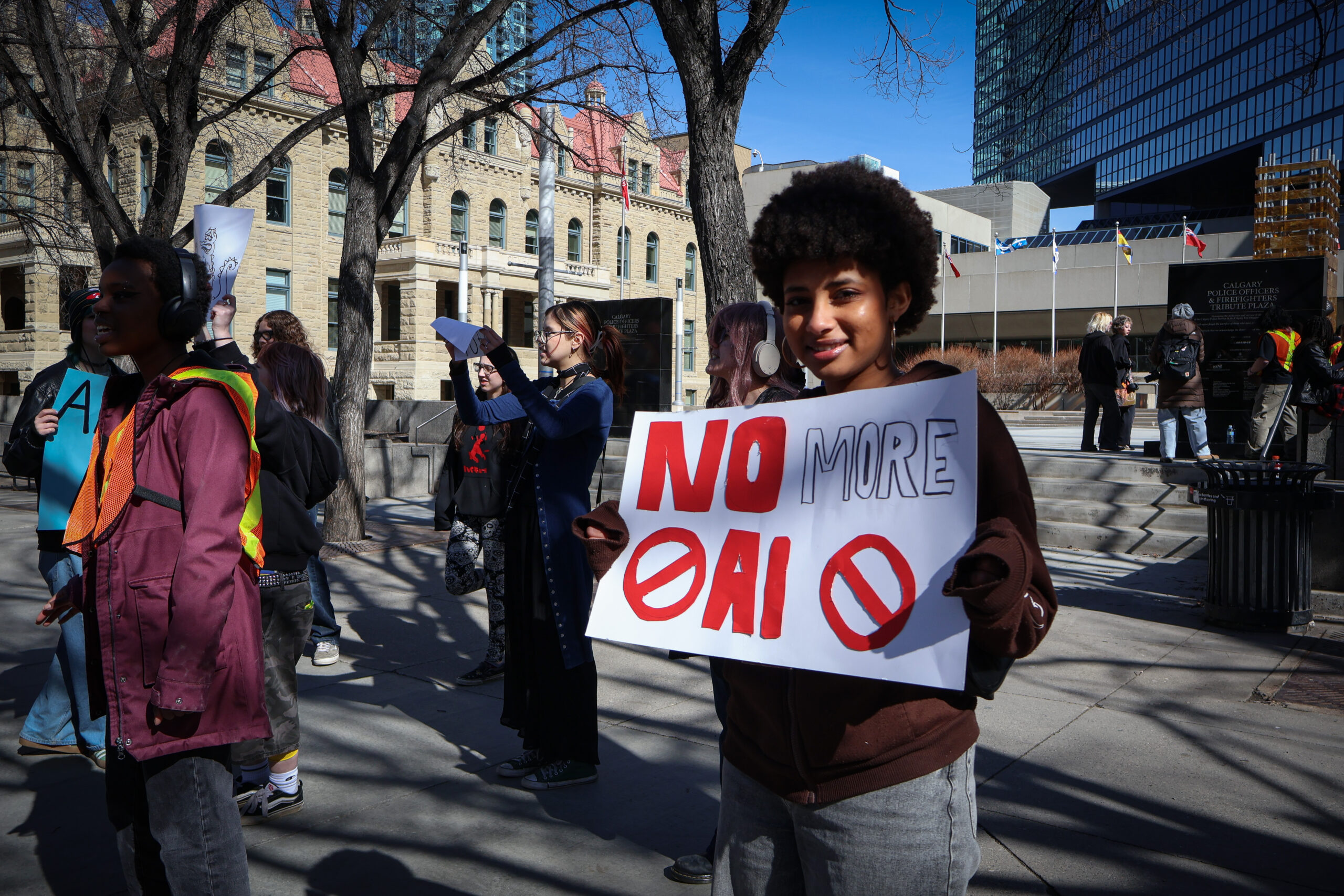 Protesters hold their signs as they chant about their concerns over artificial intelligence as passing vehicles honk in support. The demonstration continued for nearly an hour. Photo by Jullianah Ejoc/SAIT