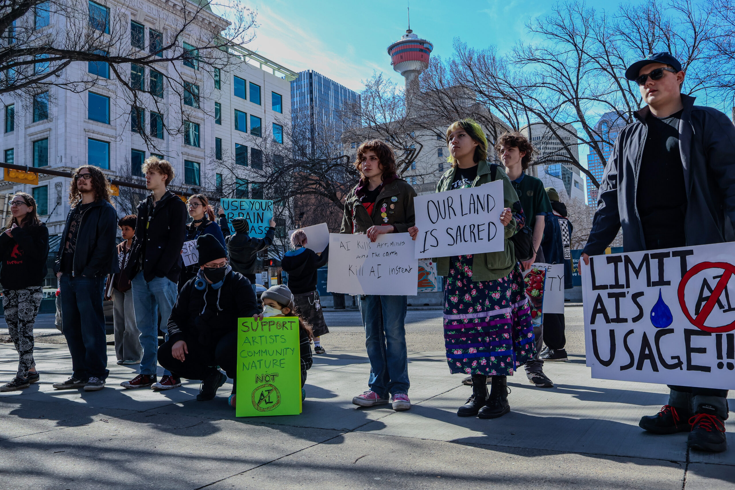 Protesters hold their signs as they chant about their concerns over artificial intelligence as passing vehicles honk in support. The demonstration continued for nearly an hour. Photo by Jullianah Ejoc/SAIT