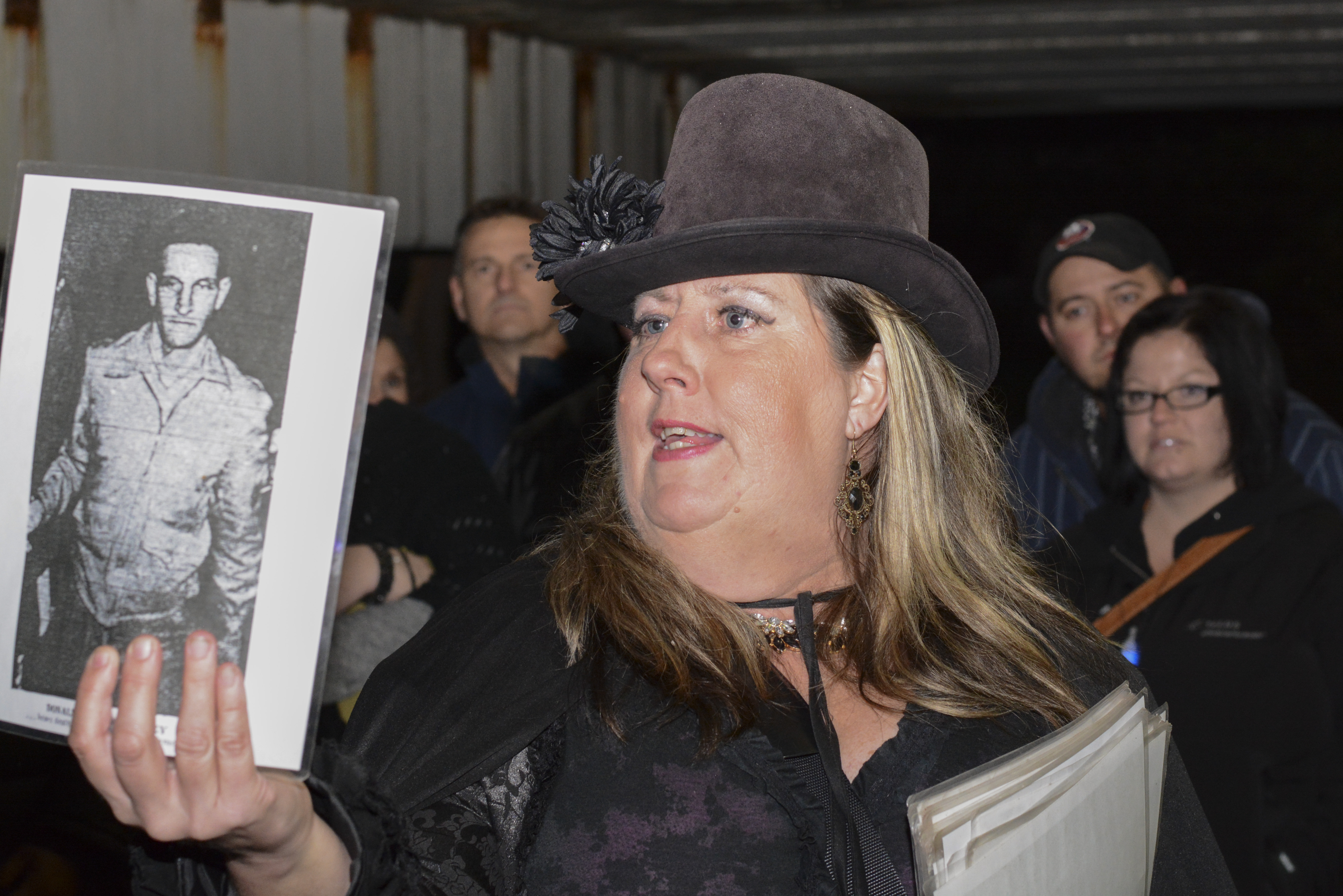 Chilling Tales: Johanna Lane,founder and tour guide with Calgary Ghost Tours, leads a group of over 30 people around Inglewood’s paranormal hot spots in Calgary on Friday, Sept. 12, 2014. Lane is showing the group a photo of a man accused of killing a little boy who supposedly haunts the Ninth Ave. bridge. (Photo by Sabrina Scarpino/The Press)