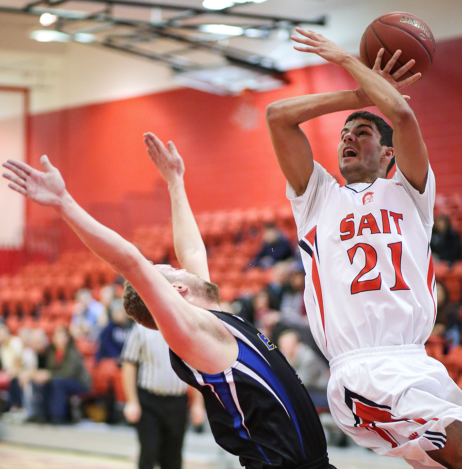 Big BlockSAIT Trojans player Mitchell Dass, right, jumps to block the ball from a King’s Eagles offender during men’s basketball action at the SAIT gymnasium in Calgary on Friday, Jan. 17, 2014. The Trojans defeated the Eagles 83-72. (Photo by Courtney Blatch/The Press)