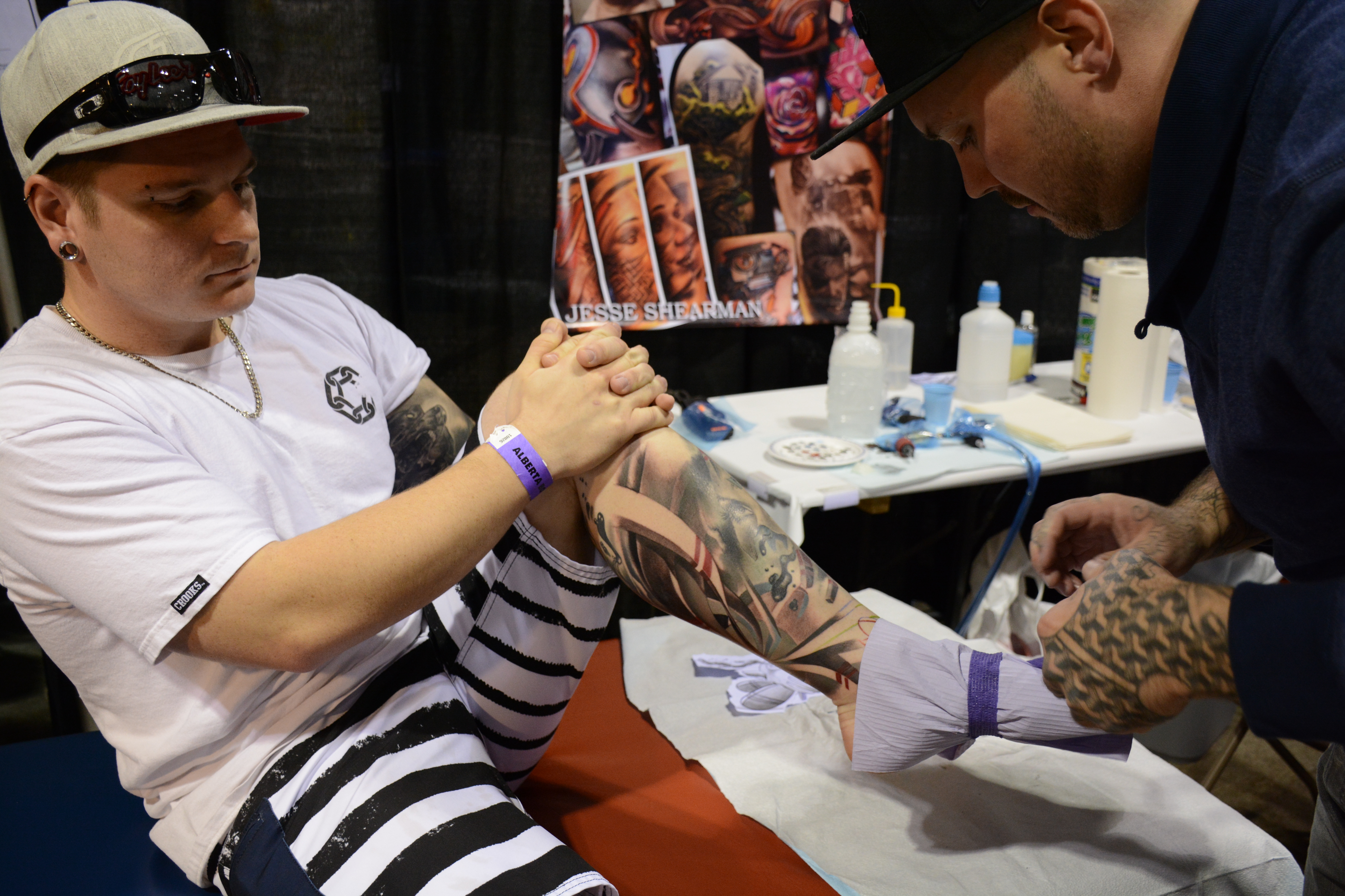 Getting Inked: Nico Farr gets a bandage wrapped around his foot after Jesse Shearman, a tattoo artist, finished up his tattoo at the Calgary Tattoo and Arts Festival. (Photo by Jocelyn Vanderveen/The Press)