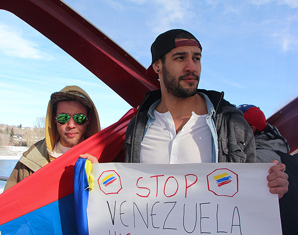 Left to right: Juan Antoni and Hugo Salazar at the gathering at the Calgary’s Peace Bridge on Feb 18. Tuesday, Feb. 18, 2014. . (Photo by Enrique Palacios/The Press)