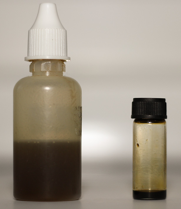 The stuff you use: Cannabis tincture,left, and honey oil,right. The Tincture can be used in regular electronic cigarettes but the honey oil must be used with a vaporizer designed for it. (Photo by Kevin Yates/The Press)