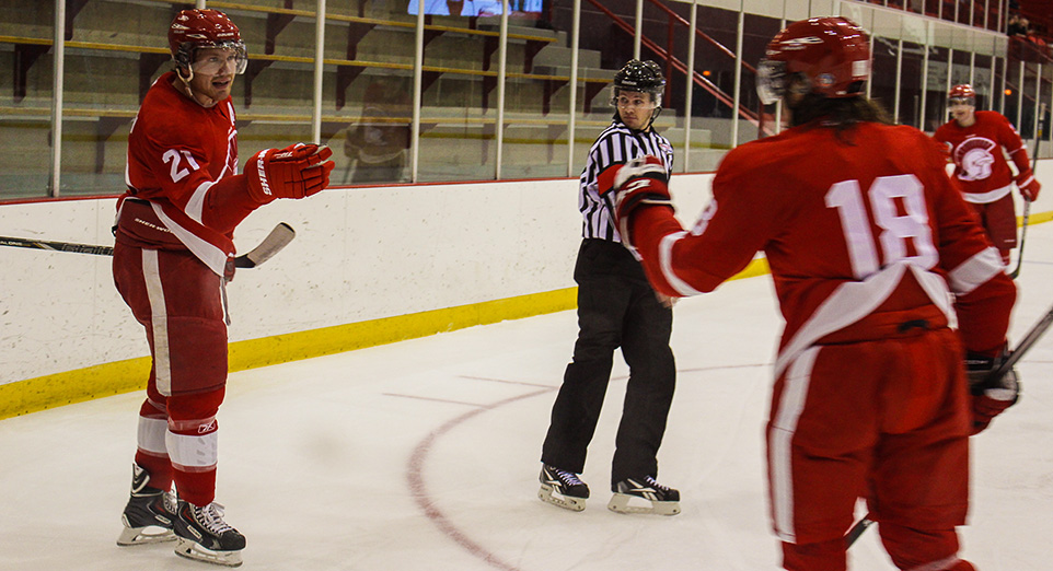 Starting off Right: SAIT Trojans forward Riley Paterson (21) celebrates with Jesse Ismond (18) after scoring a goal in SAIT’s home opener game at the Campus Centre Arena in Calgary. Paterson was the second leading scorer for the Trojans last season. (Photo by Luke Geddes/The Press)