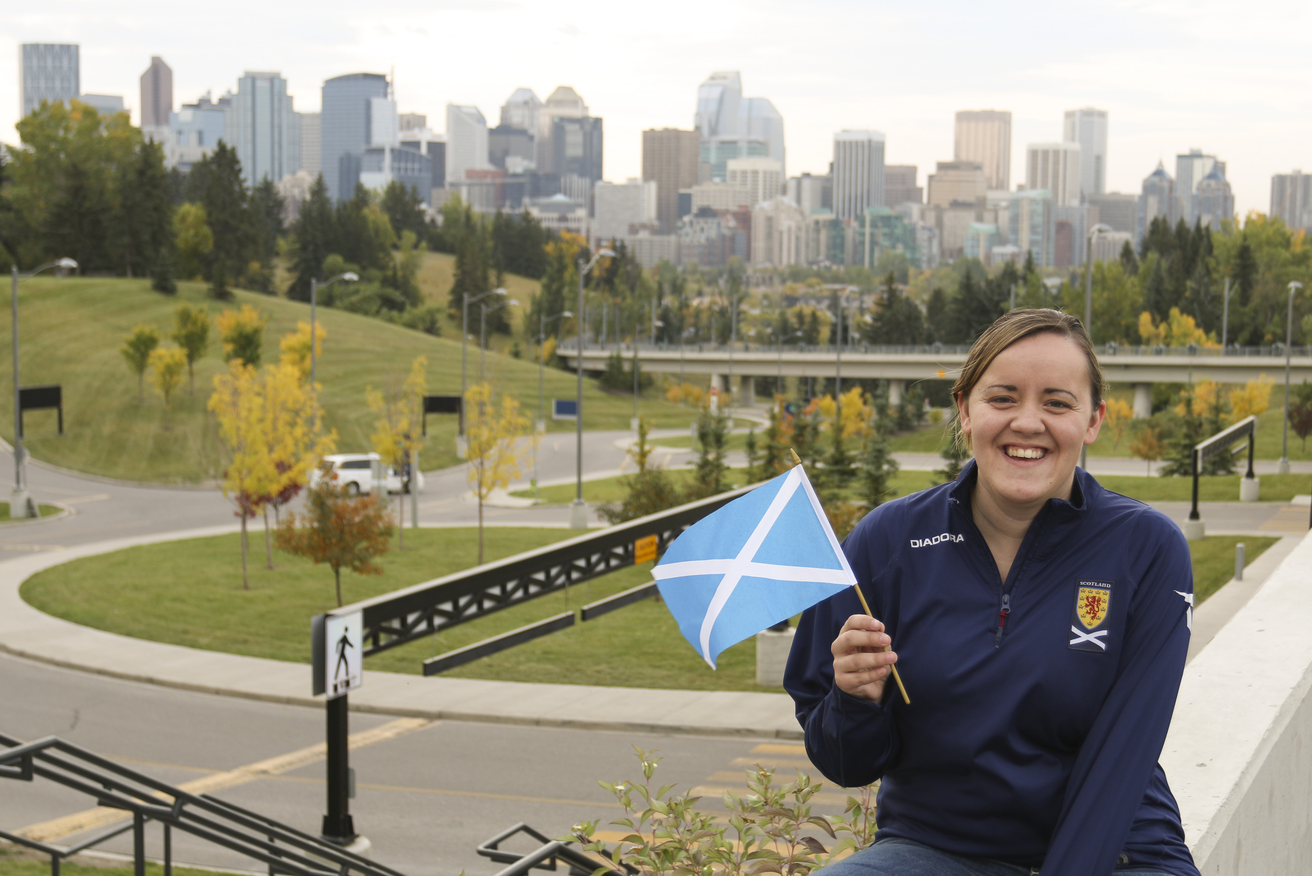 A New Home: Cat MacKay pictured representing her home country in Calgary. MacKay moved to Canada in 2008 from Oban, Scotland and she is for the independence of Scotland. (Photo by Connor Morrell/The Press)